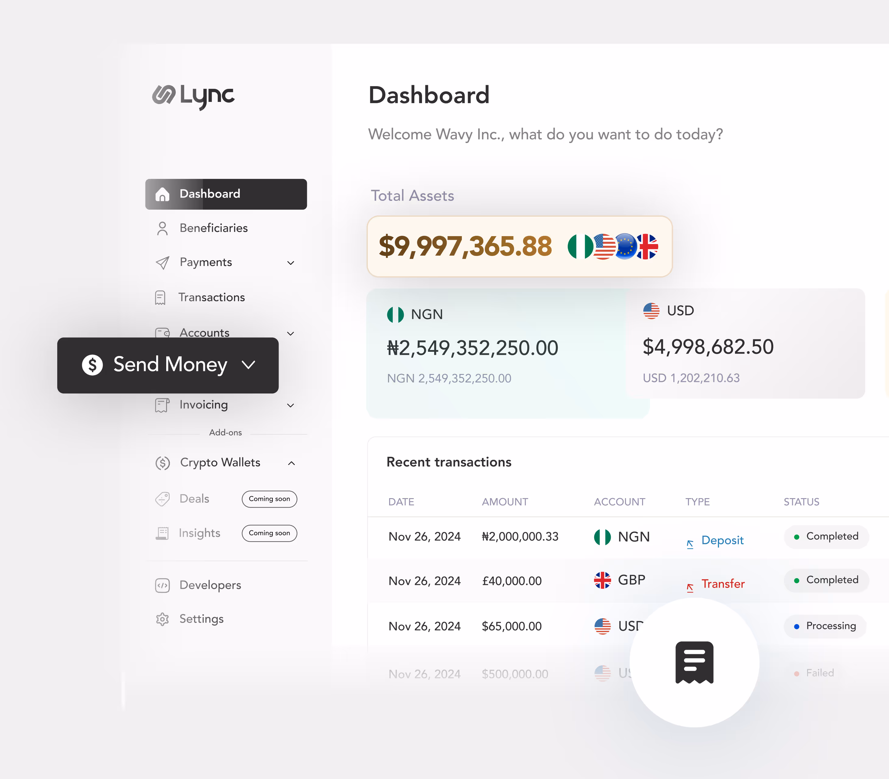Lync gives you simple, reliable APIs to embed global and local banking into your product. From virtual accounts to multi-currency collections, exchange and payouts for your business.