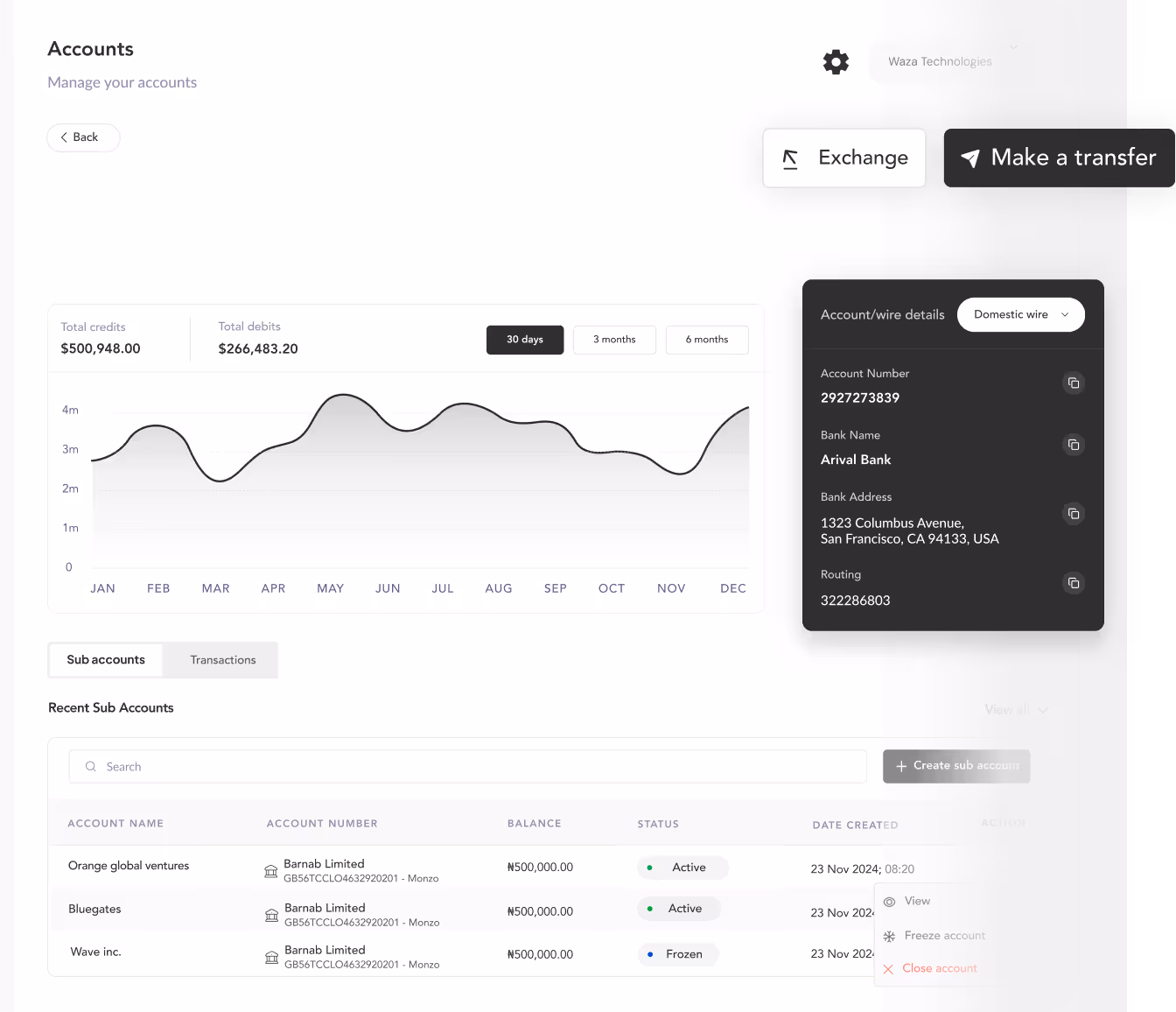 Create dedicated sub-accounts under your main business account to manage expenses with more control using our APIs. Separate funds by teams, projects, or departments. Perfect for startups, platforms, and enterprises managing multiple cost centers.